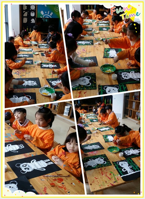 这周的创意美劳孩子们画了可爱的大熊猫呢!只见孩子们在黑色卡纸用白色颜料画出了憨态可掬的大熊猫,之后还画了大熊猫最爱的美食——竹子!多么可爱啊!