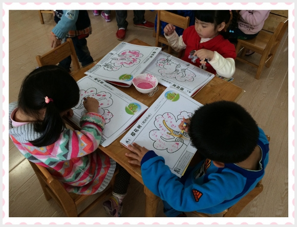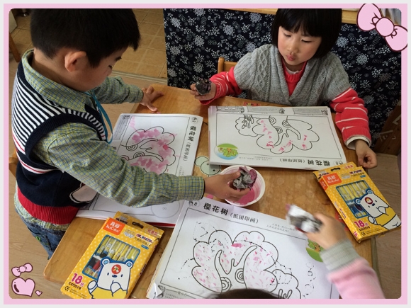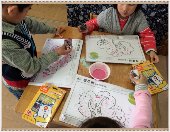 【中三】美术:樱花树 发布人:王修月 发布时间:2014/4/10 9:09:21 今天,我们一起来画美丽的樱花树。翻开画册,是一副没有颜色的樱花树。王老师给小朋友们准备了颜料和报纸球。小朋友们用报纸球蘸上颜料,在画册上擦上粉色的颜料。大家开心的在樱花树上点出美丽的樱花。。。。。。最后用油画棒给树干涂上美丽的颜色。。。。。