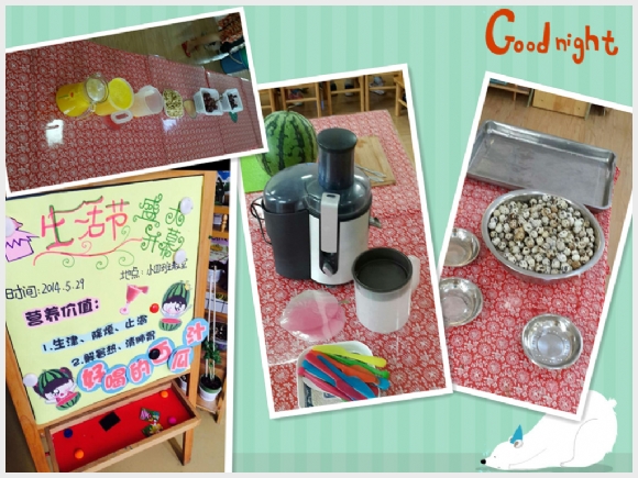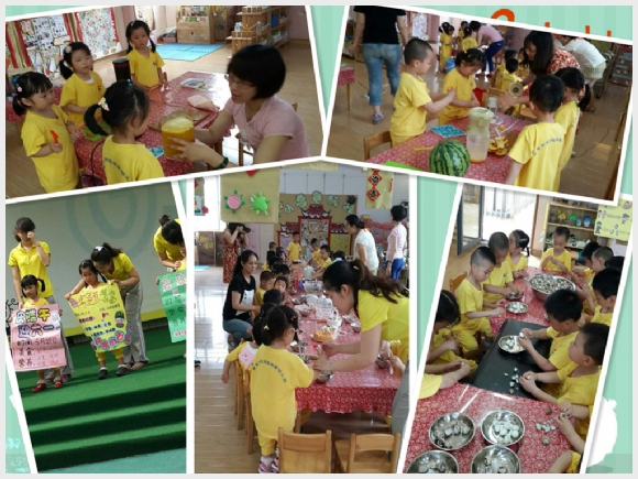 【小四班】庆端午、迎六一 ————【小四班】庆端午、迎六一 发布人:曹春 发布时间:2014/5/29 13:44:36 今天我们幼儿园开展了“庆端午、迎六一”的活动,我们好开心哦~因为我们班做了好喝的西瓜汁,瞧,我们在阿姨们的带领下一起做出了甜甜的西瓜汁,味道棒极啦!幼儿园的大哥哥大姐姐都来我们班品尝呢,老师也带着我们去大哥哥大姐姐班吃了烧卖、馄饨、饼干、薯条......真的好好吃哦,嘿嘿~~午饭我们还吃了粽子,还有阿姨们给我们带来的好吃的。我们小肚子吃的饱饱的!同时我们也祝福全世界的小朋友端午节快乐、儿童节快乐哦~~欢迎来我们小四班喝好喝的西瓜汁哦~~ ![]() ![]() ![]()
