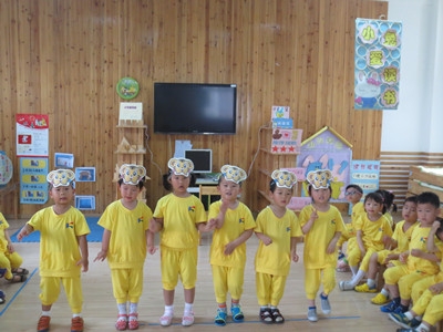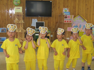 听着音乐,孩子们戴着老虎头饰,自己创编着喜欢的动作进行表演。