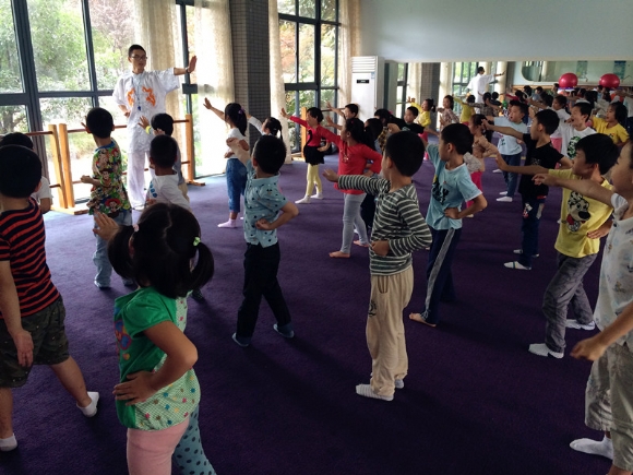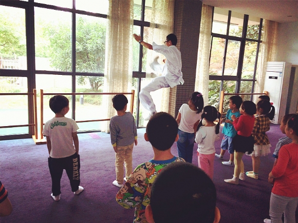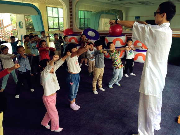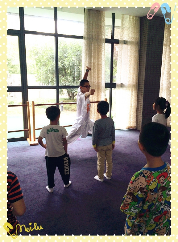 【大三】功夫小子养成记! 发布人:王修月 发布时间:2014/9/17 14:13:10 本学期,幼儿园请来了一位武术教练。专门教小朋友练武术,每周我们都会和这位“武林高手”——张教练,学习武术。旨在强生健体,弘扬中国武术文化~~!当然啦,每个小朋友对于武术活动都很感兴趣,见识到正真的武术功夫后,小朋友们都很兴奋。在第一次活动中,我们首先学习了武术中的礼仪——抱拳礼。还学了基本的几招——拳、掌,勾手。还有基本的几个腿部动作——弓步、和马步。瞧,我们学的一个个有模有样的!期待下一次精彩的武术活动。