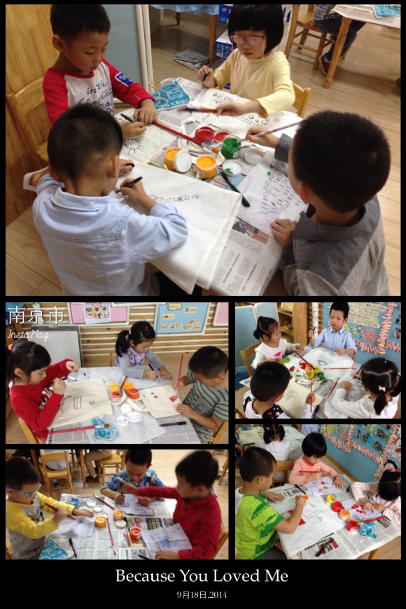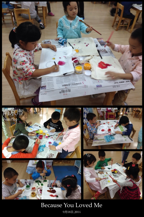 你看~我画了一个太阳,还有小花;我画了大海沙滩;我画的是公主…… 孩子们都是小小设计师,创造了各种不同的“时尚购物袋”~