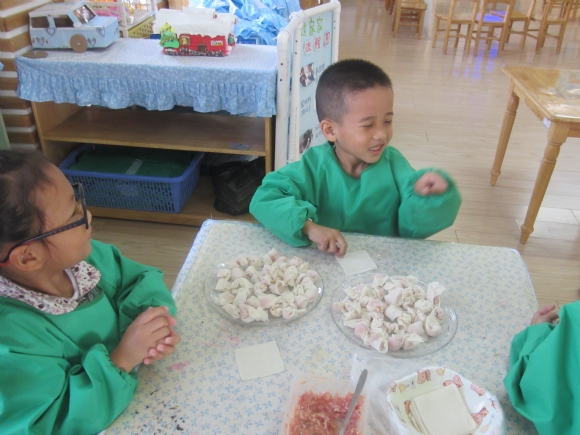 谢谢爸爸妈妈帮我们准备的材料~~我们把小手洗干净啦,根据老师教给我们的流程,开始动手喽!! 不一会儿,我们包了这么多的馄饨哦~~很厉害吧呵呵 馄饨下锅喽,好期待哦~~我们肚子开始叫啦~~哈哈