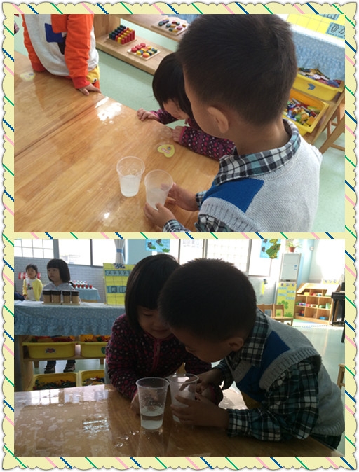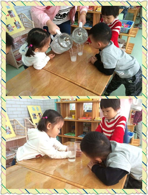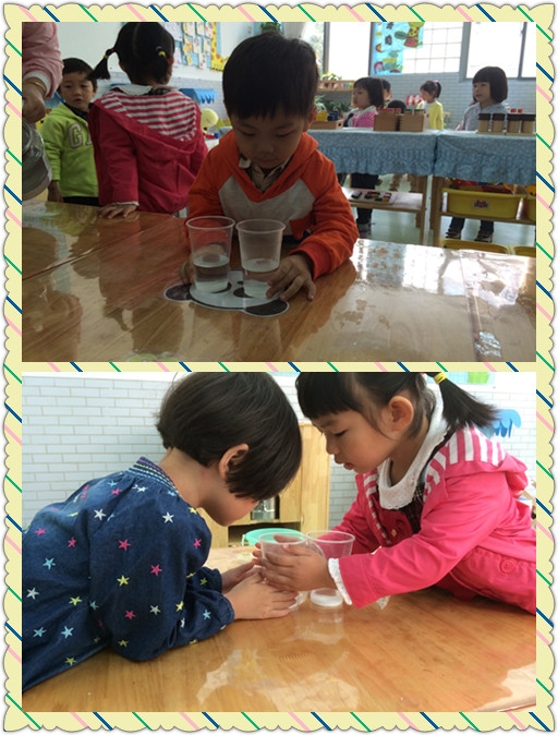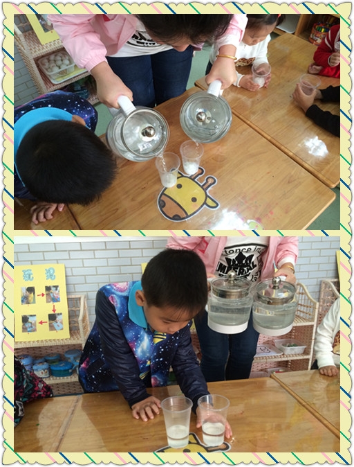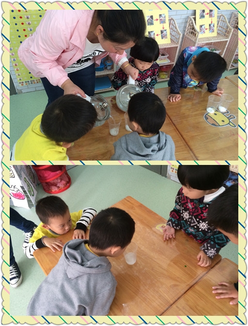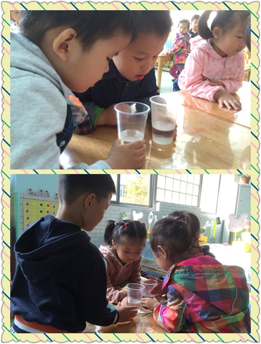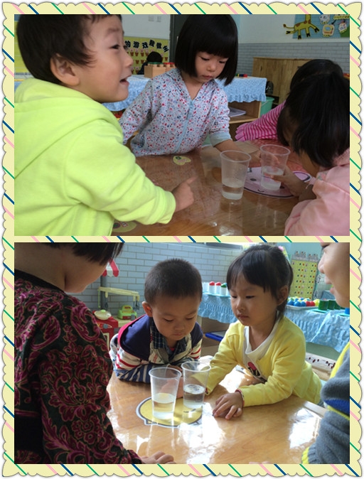 【小七班】糖宝宝不见了~~~ 发布人:陈珊珊 发布时间:2014/10/17 11:48:00 你们知道白糖是什么样子的吗?它是什么颜色的? 又是什么味道的呢? 今天我们不仅认识了白糖,而且做了一个很有趣的小实验呢~~~ 白糖遇到冷水化的快还是遇到热水化的快呢? 在我们的仔细观察下,我们终于知道答案啦~~~