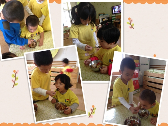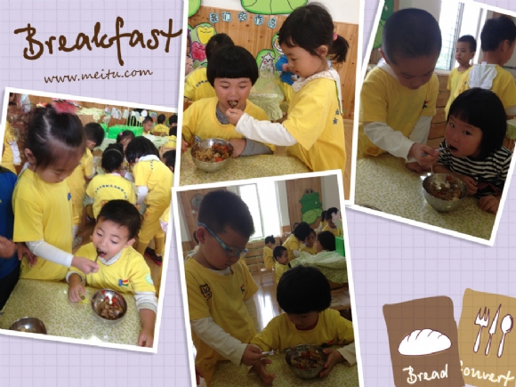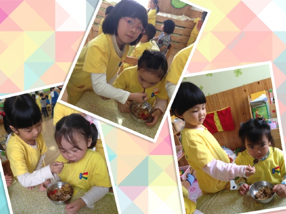 我们可细心了,挖了一小勺饭,小心的喂给弟弟妹妹们吃。