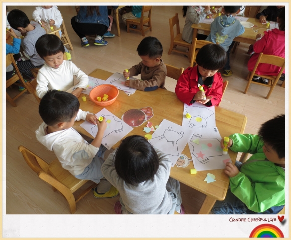 小朋友们表现的好棒呀!图形之间知道要空距离,材料知道要大家一起用,你们是能干的小宝贝!