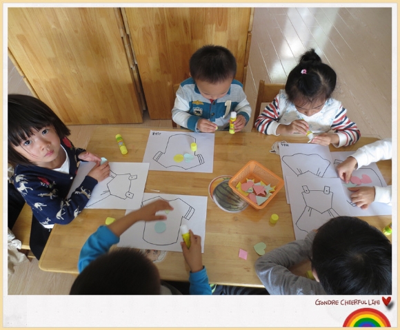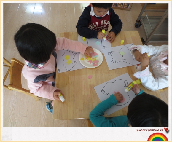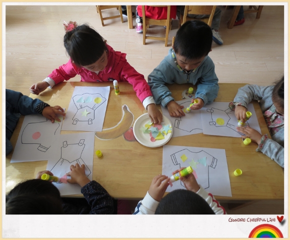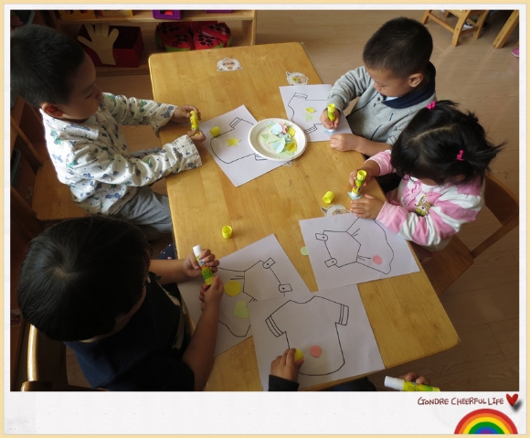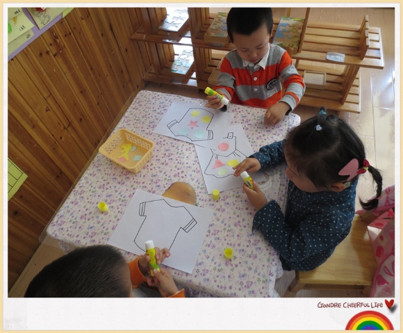 在老师教授粘贴方法时,孩子们学的很用心哦!爸爸、妈妈快看看宝贝们粘贴的衣服多好看呀!