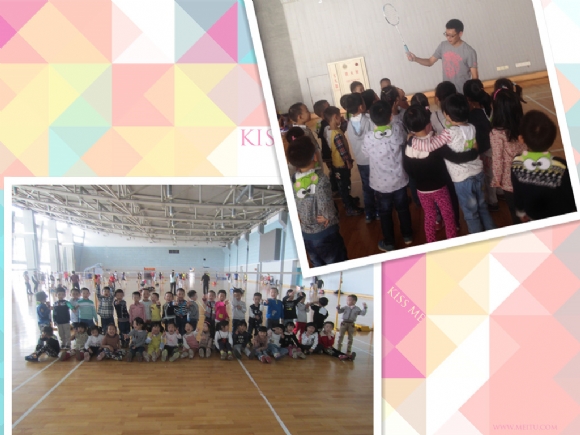 这是羽毛球馆,瞧~叔叔在给我们介绍羽毛球拍呢。
