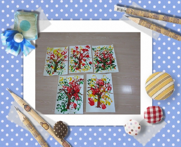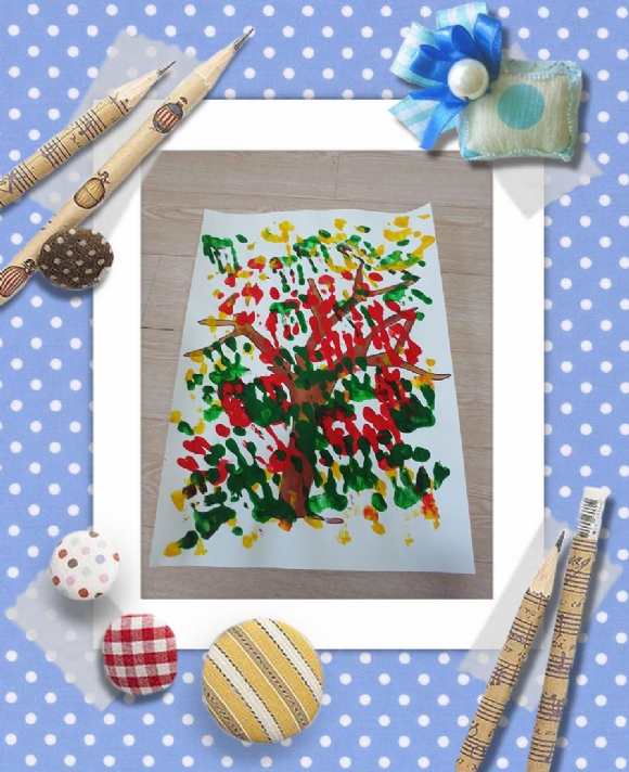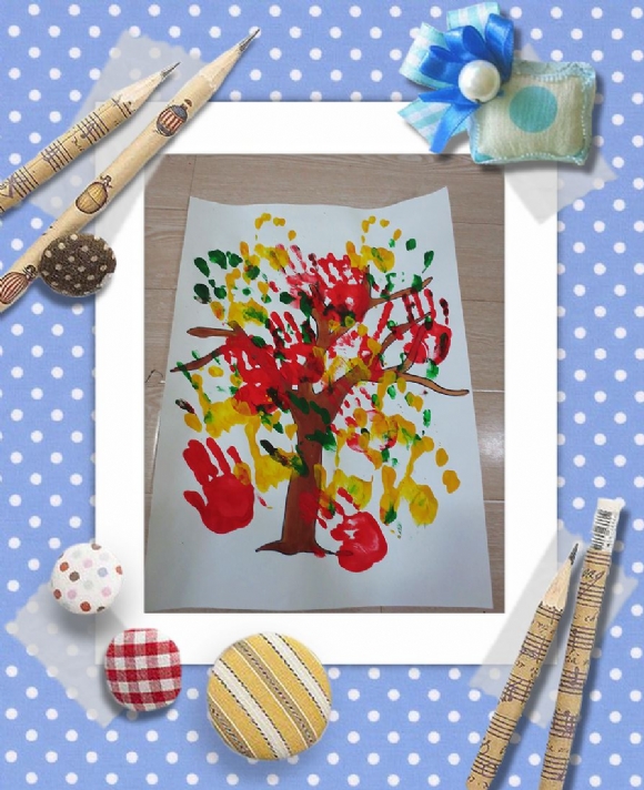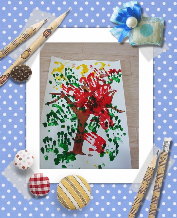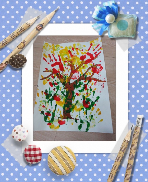 小朋友们自己卷起了袖子,轻轻在颜料盘里蘸一蘸,再将小手在画有树干的白纸上印一印,就这样大树妈妈的身上又重新长出了漂亮的叶子。