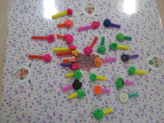 首先把油泥放在桌面上,双手在油泥上来回的搓着,不一会刚刚还是扁扁的油泥一下子变成了小长条,好似一条条可爱的小蛇。接着再将小长条卷成圆形,并且越卷圆形就变得越大,很快波板糖的外形就做好了,在插上吸管,就这样“美美的波板糖”做好了。