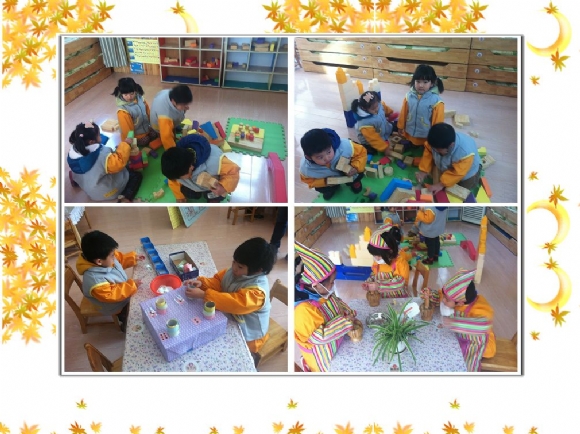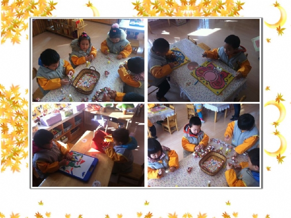 一群小建筑师们正在合作搭建楼房,这边餐厅里的小厨师们也在制作美味的“土豆泥”,萌萌在玩看点子套纸圈的游戏,逸逸小朋友正在给饿肚子的小动物送糖果呢!看,宝贝们玩的多认真呀!