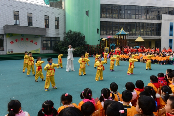 我们在看哥哥姐姐表演武术!我们现在也在学习武术了,等我们大了也可以表演了!