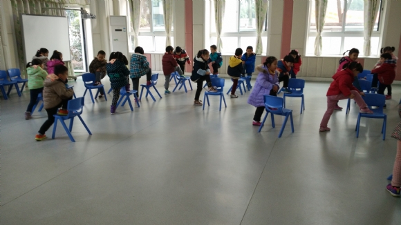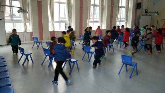 绕着椅子跑,我们都没有撞在一起,也没有碰到小椅子哦。