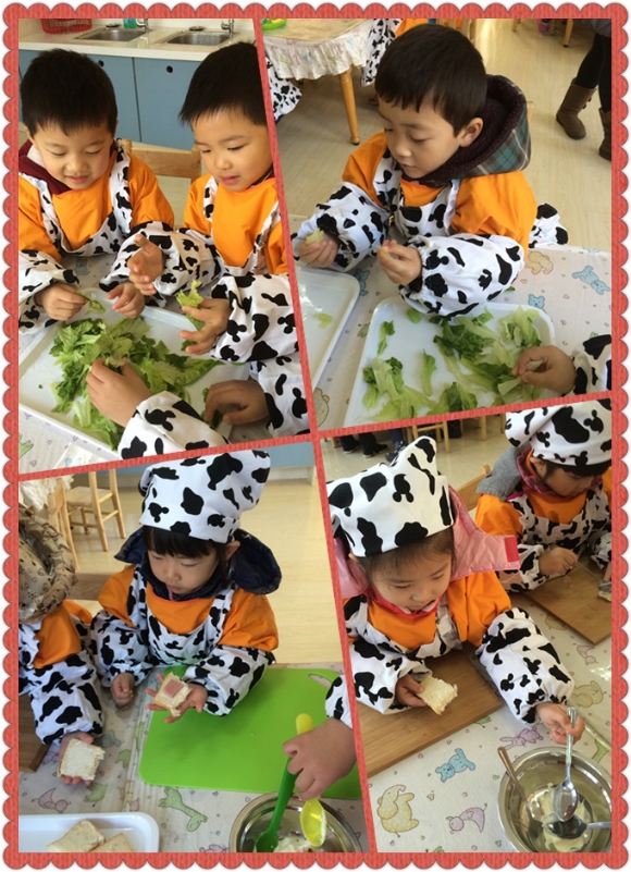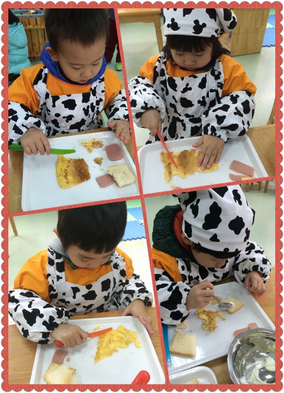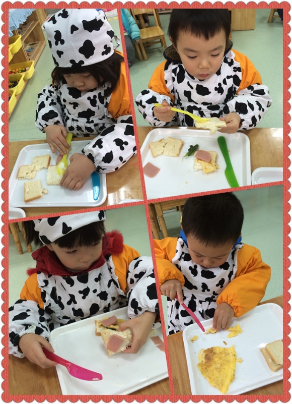【小七班】我会做三明治啦~~~ 发布人:陈珊珊 发布时间:2015/2/4 15:31:46 三明治是我们小朋友很喜欢吃的~~可是你们会做吗? 今天我们去生活馆学做三明治啦! 瞧!我们学的可认真啦!而且非常好吃哦! 客人老师都夸我们呢~~~~