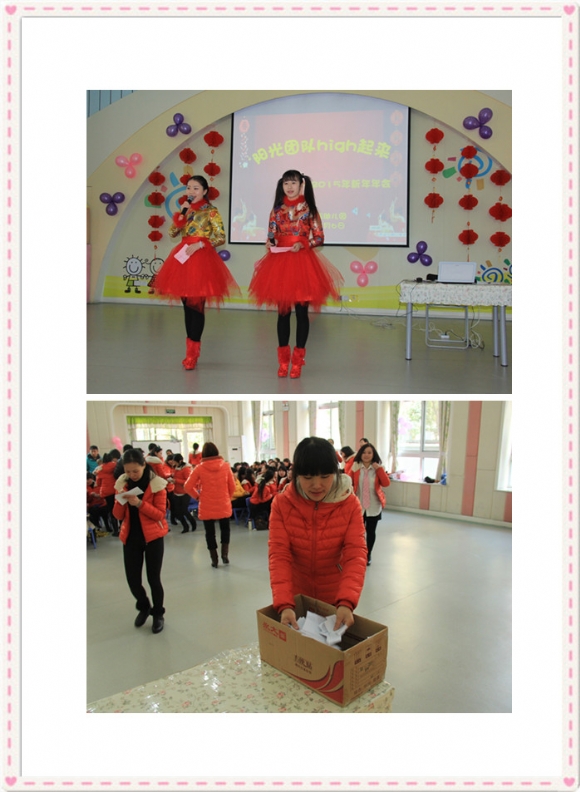 建实幼开展“阳光团队high起来”迎新年年会 发布人:张慧 发布时间:2015/3/2 17:24:04 2014年在忙碌中飞逝而去,我们迎来了崭新的2015年。在新年到来之际,建邺区实验幼儿园开展了“阳光团队high起来”——2015年新年年会,建实幼总园和分园的全体教职工均参加了此项活动。 年会开始,首先召开了教职工大会,会议上分别由园长吴兴莉、园长助理张蓉、工会主席唐云霞做了年终各项总结汇报,大家仔细聆听,共同分享这一年“丰收”的喜悦。紧接着,会计陈怡向全体教职工做了关于工会经费使用审查情况和幼儿园经费使用情况汇报,让大家明确地了解了幼儿园的财务状况。随后,针对幼儿园领导班子开展了民主评议活动,公开、公平、公正的评议了我园领导班子为群众服务的情况。紧接着,激动人心的迎新年庆祝会活动拉开了帷幕,大家分成小组,各显神通幽默风趣的展现了阳光教师的运动风采,编排和表演了各种各样的健身韵律操活动。游戏活动《撕名牌》、《我演你猜》和《抱一抱》赢得满堂喝彩,优美的舞蹈、动听的旋律……把年会一次又一次推向高潮。 最后,伴随着园歌《美好未来》的唱响,建邺区实验幼儿园年会活动落下了帷幕。2015年,让我们携起手来共同创造无限的可能,相信建邺区实验幼儿园的明天会更加美好!(信息员 张慧)
