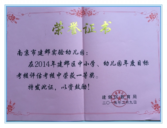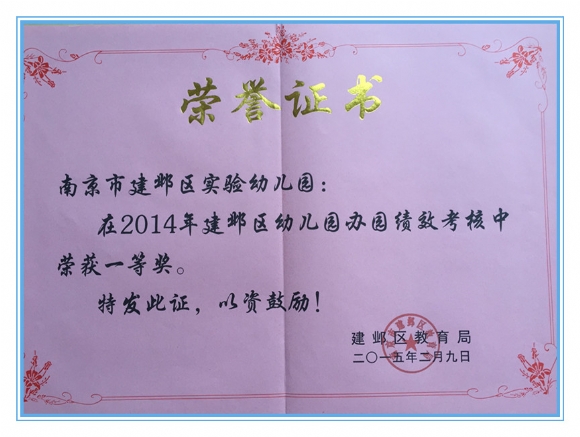 喜报:建实幼喜获区绩效考核一等奖、目标考核一等奖 发布人:张慧 发布时间:2015/3/4 16:13:29 近日,从建邺区教育系统负责干部会议上传来好消息:我园在2014年度荣获办园绩效考核一等奖和年度目标考核评估考核一等奖。 历年来,建邺区实验幼儿园秉承“阳光成长”文化教育理念,倾心培育爱运动、知礼仪、乐交往、善学习、会合作的阳光宝宝。2014年,在阳光团队的共同努力下,我园取得了喜人成绩,得到教育主管部门和社会各界的充分肯定。 今后,我园将立足新起点,向内求索,向外开拓,通过开展丰富多彩的各项活动,不断增强幼儿园的生机和活力,推动幼儿园工作跃上一个新台阶。(信息员 张慧)
